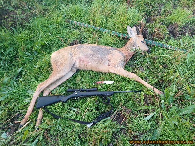 | Охота получилась интересной , долгая утрянка. на манок не реагировал никто. уже собрался обратно к машине, решил срезать через лесок, и с краю уже с лёжки поднялся козлик. отбежал на метров 500 и потихоньку шёл в круг , меня он не видел, трава была высокая, я быстрыми шагами против ветра сократил дистанцию и присел, он или заметил меня или услышал, но опять припрыгивая пошёл в круг на расстоянии метров 150. я сидел наблюдал в траве. потом он наконец остановился, я встал в полный рост , поставил ружьё на упор и ловлю в оптику, он меня уже ясно видел, и встал прямо на меня . Выстрелил прямо в грудь - упал сразу. Расстояние 110 метров.